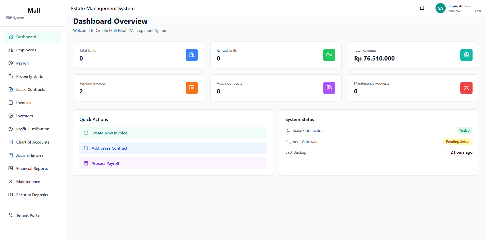 Sistem ERP terpusat dengan modul Automated Billing, integrasi smart meter IoT untuk listrik/air, dan portal mandiri untuk Tenant (Self-Service Portal).